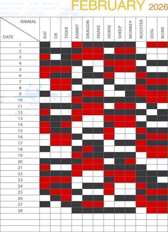 The date given is based on your local time, minus daylight saving if any. It is important that you do not engage in any of the above activities if it is a bad day for the animal sign you were born under. A simple method used to find a most excellent day for you would be either 6 days before or after the day that is most unlucky for you.