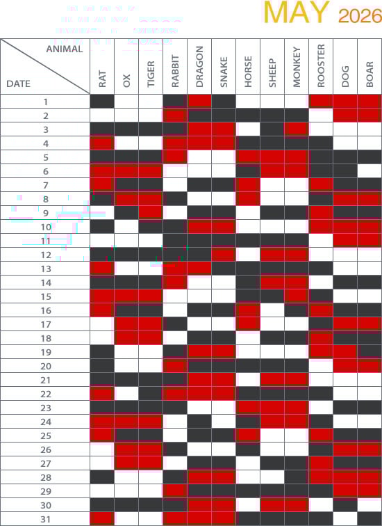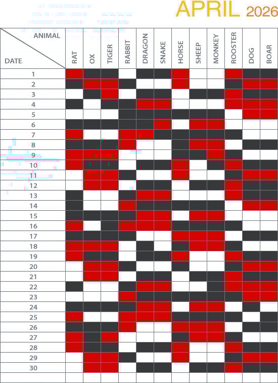 The Feng Shui Almanac, or the Tung Shu, is a table days. These calculations are based on the heavenly branches and earthly stems of the day. These results in a simple to understand table that tells us the most auspicious times to engage in various activities that are outlined below. Knowing your animal sign also gives you familiarity with the Chinese lunar calendar. You can click here to investigate your animal sign or check any of Lillian Too's feng shui books to consult the 100 year calendar.