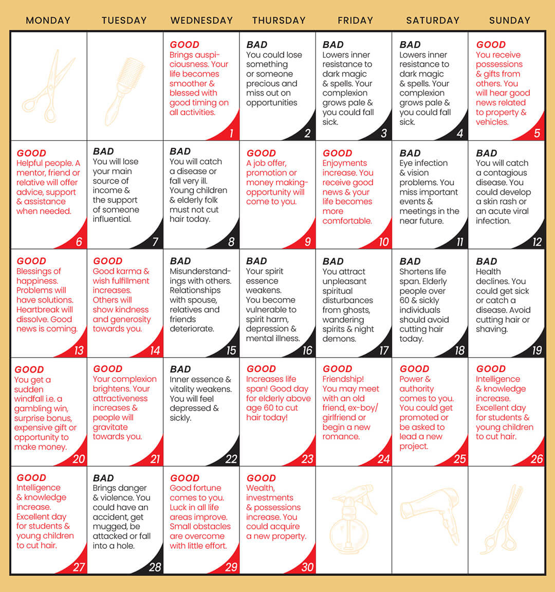 There is a little-known and rare sutra which reveals the consequences of cutting your hair on the wrong days – and the extraordinary benefits of cutting it on the correct day. The right and wrong days are based on the Tibetan Calendar and for your benefit, WOFS.com has transcribed these good and bad days into the Western dates for you.