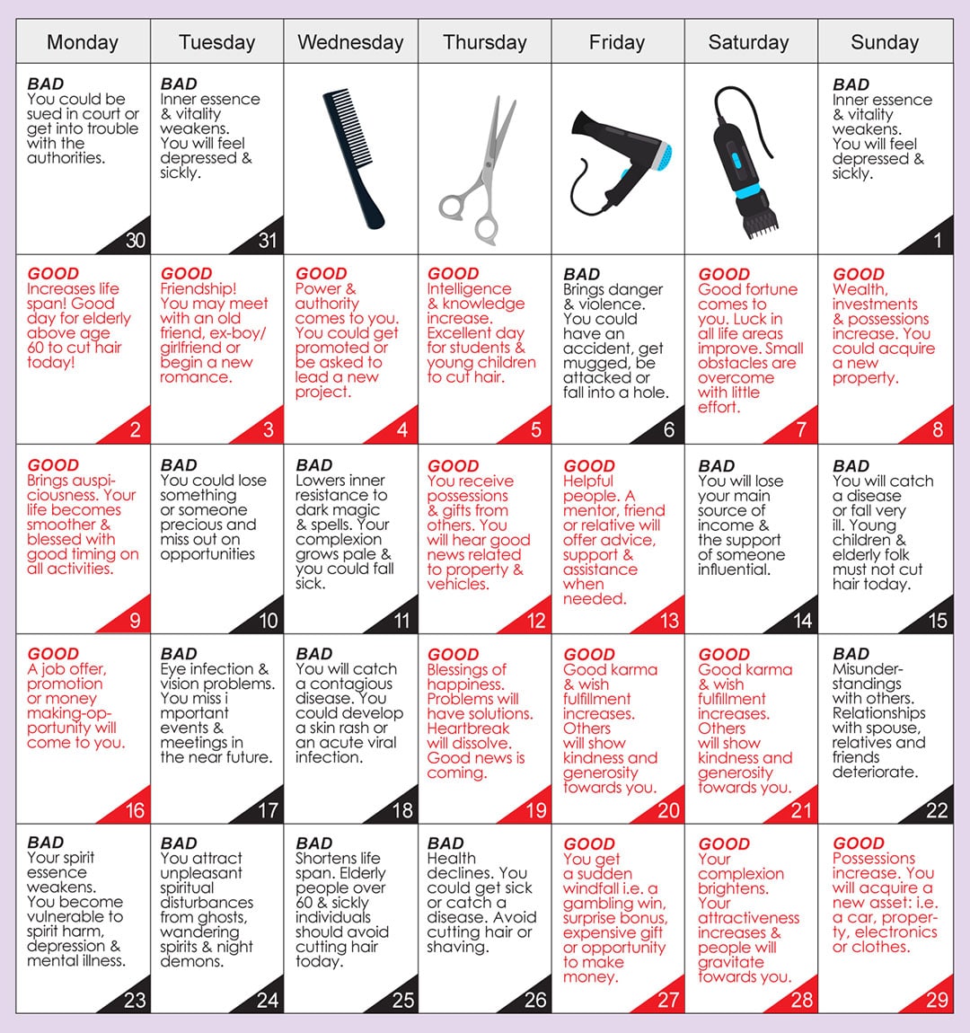 There is a little-known and rare sutra which reveals the consequences of cutting your hair on the wrong days – and the extraordinary benefits of cutting it on the correct day. The right and wrong days are based on the Tibetan Calendar and for your benefit, WOFS.com has transcribed these good and bad days into the Western dates for you.