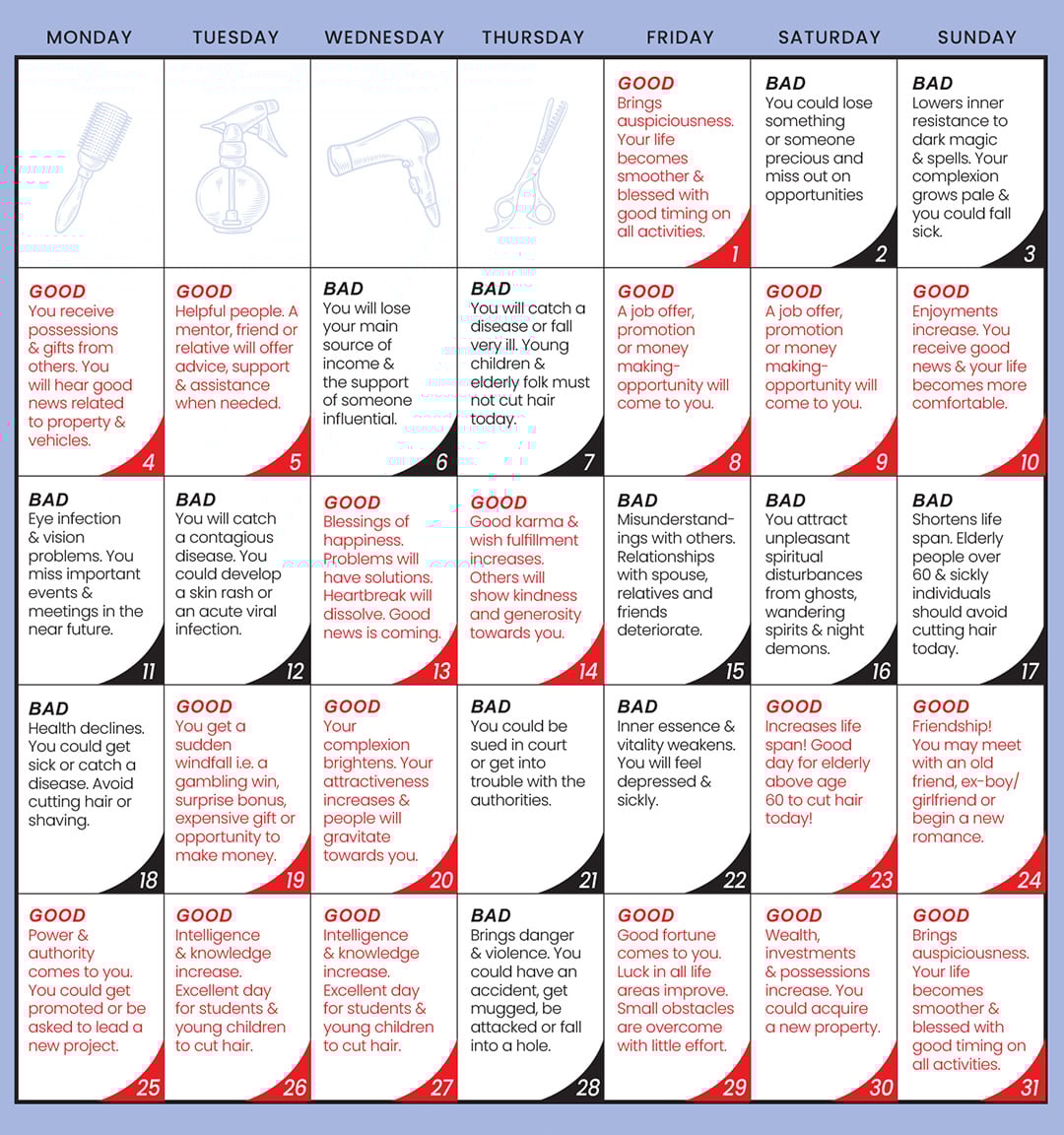 There is a little-known and rare sutra which reveals the consequences of cutting your hair on the wrong days – and the extraordinary benefits of cutting it on the correct day. The right and wrong days are based on the Tibetan Calendar and for your benefit, WOFS.com has transcribed these good and bad days into the Western dates for you.